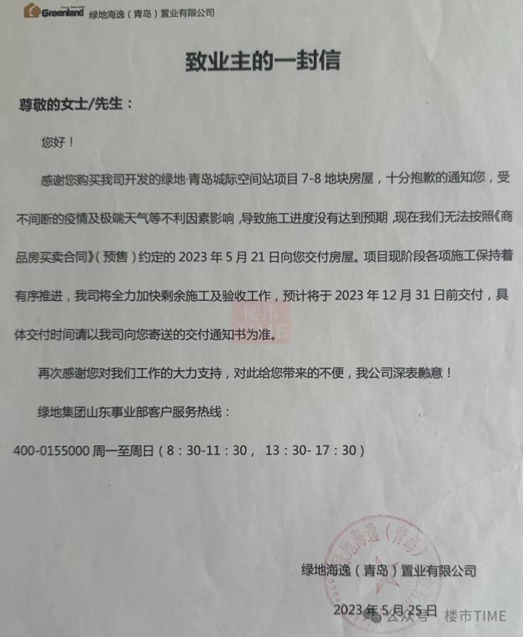 业主根据购房合同算账,7-8地块(四期四季印象)逾期交房的违约金,一户得赔五万多,但是开发商有钱赔吗?绿地在全国范围资金紧张,项目频频爆雷,烂尾项目一抓一大把。青岛西海岸的绿地城际空间站,只是众多“躺平”项目之一,业主现在的希望是:开发商绿地别倒闭、别躺平。只是,已经转型卖车的绿地,还能翻身吗?