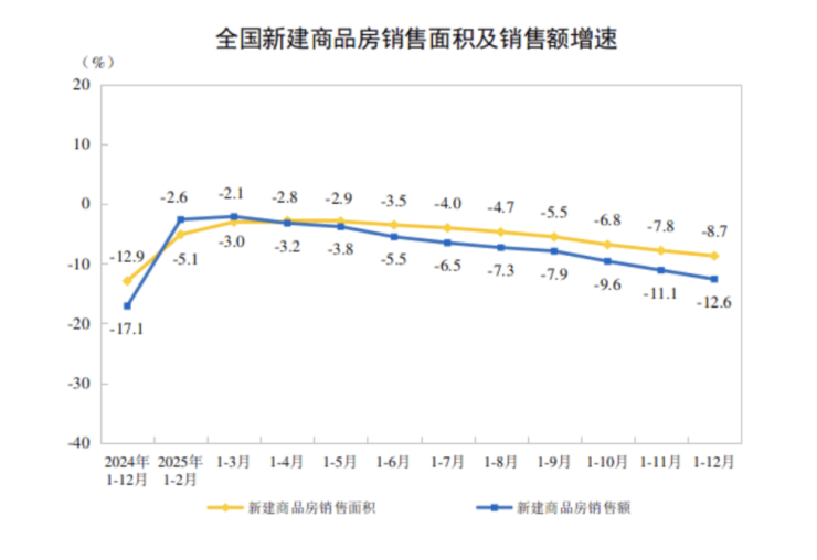 国家统计局数据显示,2025年,全国新建商品房销售面积88101万平方米,同比下降8.7%;其中住宅销售面积73299万平方米,同比下降9.2%。