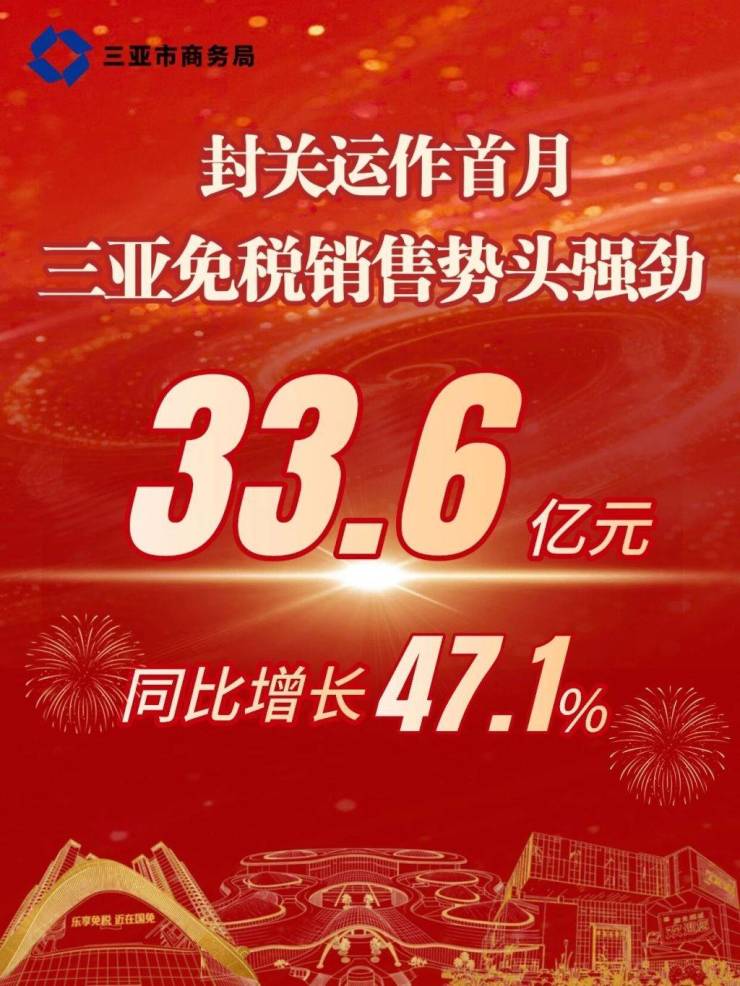 据三亚市商务局1月18日发布的消息,封关运作首月,三亚免税销售33.6亿元,同比增长47.1%。