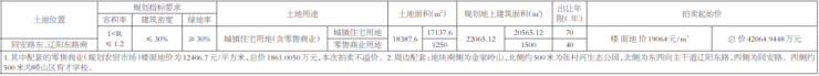 地块位于同安路东、辽阳东路南,占地面积18387.6㎡,容积率1.2,建筑面积22065.12㎡。城镇住宅用地,规划住宅建面约20565.12㎡,商业1500㎡。起拍楼面地价为19064元/㎡,出让总价4.21亿元起。