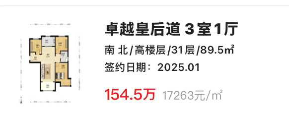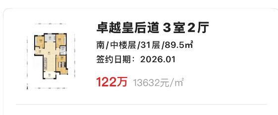 比如,位于东李的卓越皇后道,同样31层的89㎡户型,去年年初成交单价在1.73万而如今1.36万,一年时间下跌21%。